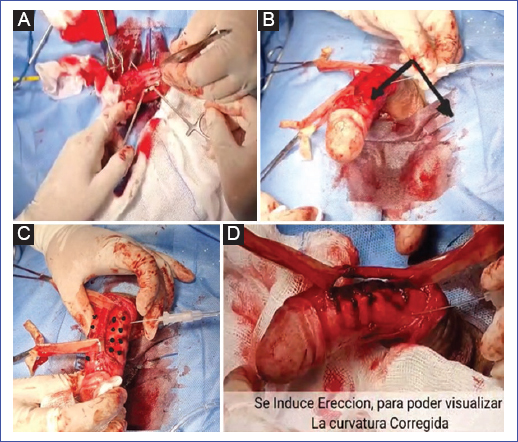 El paciente es diagnosticado como incurvación peneana ventral congénita y se decide intervenirlo quirúrgicamente para su corrección. Se realiza una rotación de cuerpos cavernosos según la técnica de Shaeer III modificada. La diferencia con la técnica original radica en la disposición y la aproximación de los puntos de plicatura transversal de la túnica albugínea. Se inicia la cirugía con la movilización de la bandeleta neurovascular dorsal (Fig. 2A), se induce la erección máxima con solución salina, presenta una curvatura peneana ventral de 60° (Fig. 2B), y se marcan cinco líneas transversales de cuatro puntos, a 0,5 cm de la línea media, a 1 cm entre ellos y 1 cm del punto de máxima curvatura. Entonces se pasa un hilo trenzado no reabsorbible de poliéster de 2/0 en sentido transversal a la longitud de pene de dentro afuera y de fuera adentro (Fig. 2C). Los hilos se fijan con un nudo doble y se dejan marcados con una pinza de hemostasia protegida. Se induce la erección máxima con solución salina y torniquete, y se ajusta la tensión de los hilos para conseguir el enderezamiento completo (Fig. 2D). La cirugía se completa según la técnica original. El enderezamiento fue casi completo, con una curvatura residual de 10°, una pérdida de longitud de 1,5 cm y sin asimetrías residuales.