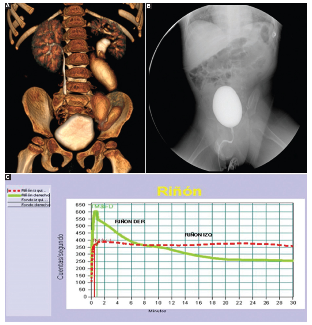 Varón de 3 años, nacido mediante cesárea por macrosomía fetal y diagnóstico prenatal de hidronefrosis izquierda moderada, quien fue llevado por sus padres a la consulta externa de urología pediátrica del Hospital Edgardo Rebagliati Martins para estudio de hidronefrosis. Como antecedentes patológicos, presentó tres infecciones urinarias con hospitalización por ser febriles. La exploración física no reveló hallazgos significativos. Los exámenes de laboratorio reportaron urea de 25 mg/dl, creatinina 0,7 mg/dl y hemoglobina 15 g/dl; análisis de orina sin alteraciones. La ecografía renal evidenció hidronefrosis grave izquierda (diámetro anteroposterior: 33 mm) con dilatación del uréter en su porción proximal (15 mm). La urotomografía contrastada y con reconstrucción de las vías urinarias mostró hidronefrosis grave izquierda y dilatación ureteral de 18 mm en toda su extensión, con adelgazamiento en su porción distal y ausencia de ureterocele (Fig. 1A). La cistografía no mostró reflujo vesicoureteral ni otros hallazgos patológicos (Fig. 1B). La gammagrafía renal con DMSA y DPTA más test de furosemida reveló cicatrices renales con una función diferencial del riñón derecho del 40,3% y del riñón izquierdo del 59,7%, grave compromiso perfusional y funcional del riñón izquierdo con eliminación retardada que no responde tras la administración del diurético, dilatación pielocalicial izquierda y grave dilatación ureteral izquierda (Fig. 1C).