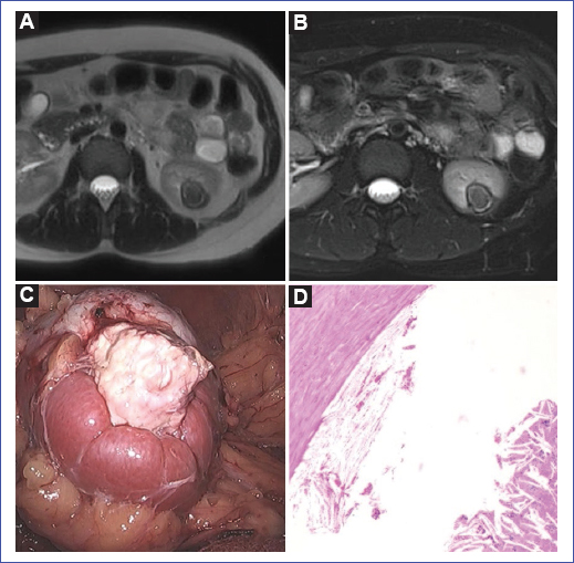 Figura 1. A: secuencia T2, imagen periférica hipointensa con componente medial hipointenso. B: secuencia T1 poscontraste sin realce significativo. C: imagen laparoscópica de la masa renal en el polo inferior derecho, exofítica, de color blanco y consistencia dura a la manipulación. D: fotomicrografía con tinción de hematoxilina y eosina que muestra pseudocápsula fibrosa y en la luz presencia de granuloma de colesterol asociado a extensa necrosis y detritus celular.